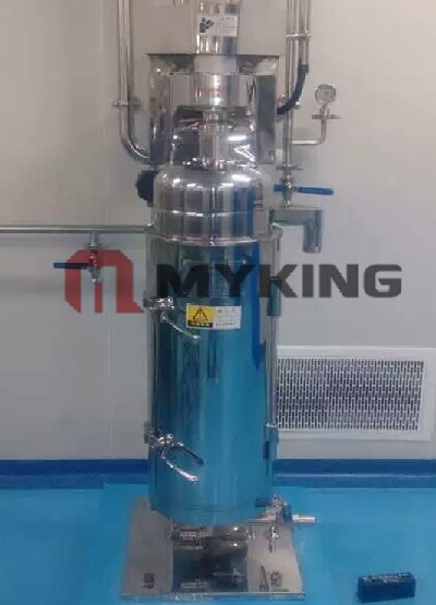 离心分离是通过离心机的高速运转 , 使离心加速度超过重力加速度的成千上万倍 , 加快沉降速度 , 以加速中药提取液中杂质沉淀并除去的一种方法 。 其原理是利用提取液密度差来分离药液 , 比较适合于分离含固量低,难于沉降过滤的细微粒或絮状物的药液 。中药提取工艺中常用的高速管式离心机的转速可达到14000 ~ 20000r·min-1 , 由于转速很快, 中药提取液在管状转鼓中行程长 , 因此能够分离一般离心机难以分离的药液物料 , 特别适用于分离中药提取液、浸膏液或分离两种不同密度的液体。高速管式还可根据工艺要求配装低温冷冻装置,离心时温度可降到5℃左右的,具体温度视冷源温度而定。
